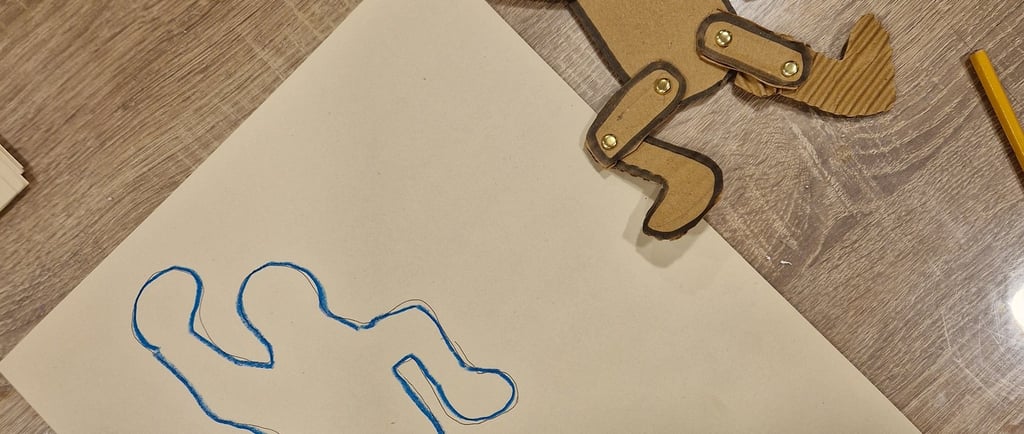 Tijdens deze les hebben we Haring’s speelse stijl gecombineerd met een leuke, interactieve techniek. De leerlingen begonnen met het maken van hun eigen poppetjes, uitgeknipt uit stevig karton. Door splitpennen te gebruiken, konden de armen en benen van de poppetjes bewegen, wat direct voor enthousiasme zorgde. Zo konden ze de poppetjes in allerlei dansende poses neerleggen, geïnspireerd op de beweging in Haring’s kunst.