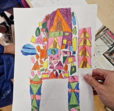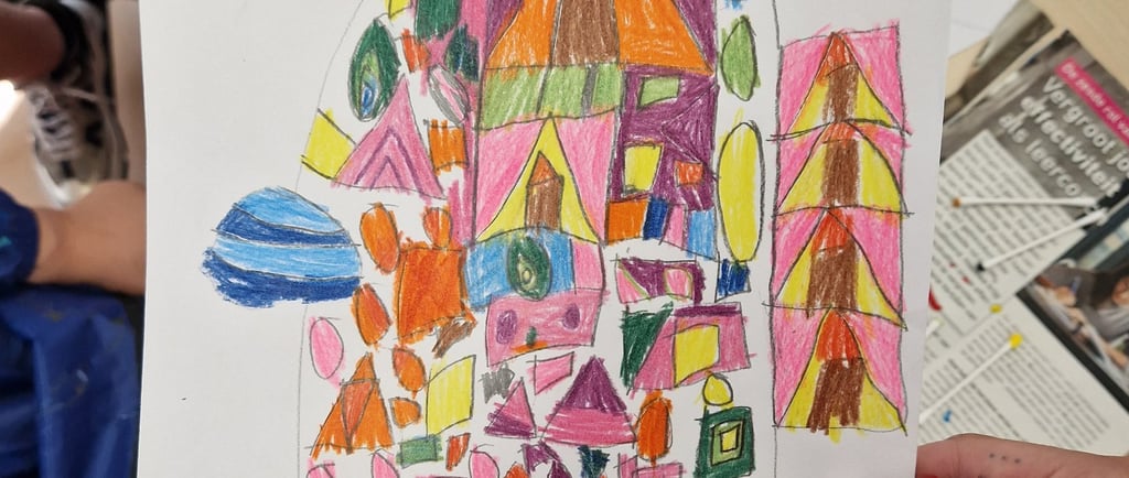 Na deze introductie gingen we aan de slag. De leerlingen begonnen met het maken van een eigen fantasierijke tekening op papier. Kleurpotloden werden gebruikt om details en levendigheid toe te voegen. Maar de echte verrassing kwam daarna: de kunstwerken werden in willekeurige stukken geknipt! De leerlingen schoven, draaiden en puzzelden met de losse delen om een nieuwe compositie te maken. Toen ze tevreden waren met de indeling, lijmden ze hun werk op een nieuw vel papier.