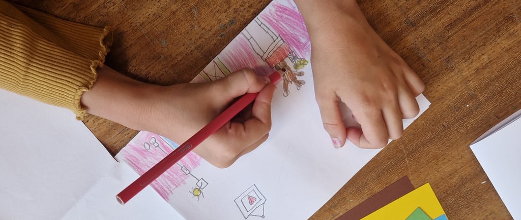Na de introductie startte het creatieve proces. De leerlingen maakten een basis voor hun eigen 3D-slaapkamer door een A3-papier zorgvuldig te vouwen en knippen. Zo ontstond een template met duidelijke muren en een vloer. Op deze basis tekenden ze hun eigen fantasievolle slaapkamer. Het was zo leuk om te zien hoe persoonlijke details naar voren kwamen: van kleurrijke bedden en schilderijen tot speelgoed en rondslingerende kleren. Elk ontwerp kreeg vorm met kleurpotloden of stiften, wat de kamers een levendige uitstraling gaf.